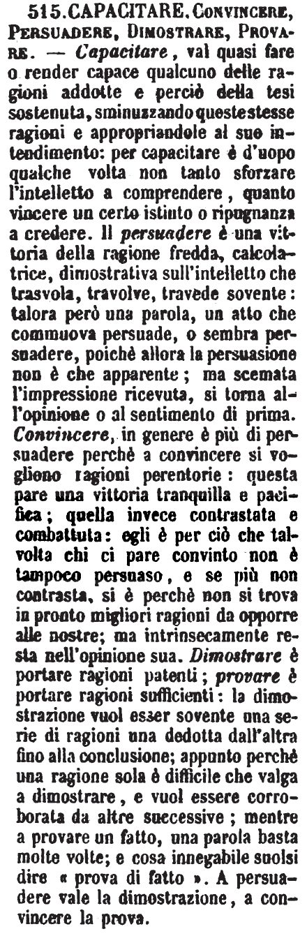 Capacitare, Convincere, Persuadere, Dimostrare, Provare - Capacitare, val quasi fare o render capace qualcuno delle ragioni addotte e perciò della tesi sostenuta, sminuzzando queste stesse ragioni e appropriandole al suo intendimento: per capacitare è d'uopo qualche volta non tanto sforzare l'intelletto e comprendere, quanto vincere un certo istinto o ripugnanza a credere. Il persuadere è una vittoria della ragione fredda, calcolatrice, dimostrativa sull'intelletto che trasvola, travolve, travede sovente: talora però una parola, un atto che commuova persuade, o sembra persuadere, poichè allora la persuasione non è che apparente; ma scemata l'impressione ricevuta, si torna all'opinione o al sentimento di prima. Convincere, in genere è più di persuadere perchè a convincere si vogliono ragioni perentorie: questa pare una vittoria tranquilla e pacifica; quella invece contrastata e combattuta; egli è per ciò che talvolta chi ci pare convinto non è tampoco persuaso, e se più non contrasta, si è perchè non si trova in pronto migliori ragioni da opporre alle nostre; ma intrinsecamente resta nell'opinione sua. Dimostrare è portare ragioni patenti; provare è portare ragioni sufficienti: la dimostrazione vuol esser sovente una serie di ragioni una dedotta dall'altra fino alla conclusione; appunto perchè una ragione sola è difficile che valga a dimostrare, e vuol essere corroborata da altre successive; mentre a provare un fatto, una parola basta molte volte; e cosa innegabile suolsi dire «prova di fatto». A persuadere vale la dimostrazione, a convincere la prova. [immagine]