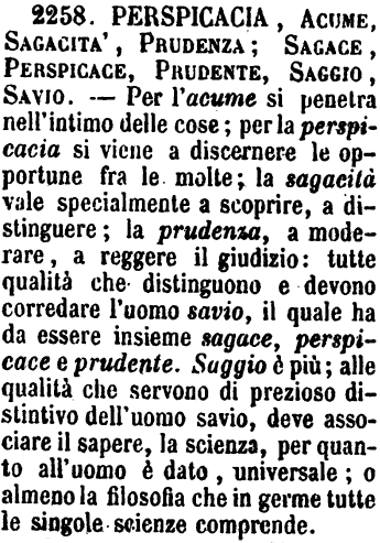 | Perspicacia, Acume, Sagacità, Prudenza; Sagace, Perspicace, Prudente, Saggio, Savio - Per l'acume si penetra nell'intimo delle cose; per la perspicacia si viene a discernere le opportune fra le molte; la sagacità vale specialmente a scoprire, a distinguere; la prudenza, a moderare, a reggere il giudizio: tutte qualità che distinguono e devono corredare l'uomo savio, il quale ha da essere insieme sagace, perspicace e prudente. Saggio è più; alle qualità che servono di prezioso distintivo dell'uomo savio, deve associare il sapere, la scienza, per quanto all'uomo è dato, universale; o almeno la filosofia che in germe tutte le singole scienze comprende. [immagine] |
