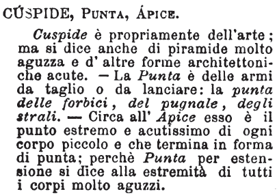 | Cuspide, Punta, Apice - Cuspide è propriamente dell'arte; ma si dice anche di piramide molto aguzza e d'altre forme architettoniche acute. - La Punta è delle armi da taglio o da lanciare: la punta delle forbici, del pugnale, degli strali. - Circa all'Apice esso è il punto estremo e acutissimo di ogni corpo piccolo e che termina in forma di punta; perchè Punta per estensione si dice alla estremità di tutti i corpi molto aguzzi. [immagine] |