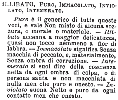 Illibato, Puro, Immacolato, Inviolato, Intemerato - Puro è il generico di tutte queste voci, e vale Non misto di alcuna sozzura, o morale o materiale. - Illibato accenna a maggior delicatezza, quasi non tocco nemmeno a fior di labbra. - Immacolato significa Senza macchia di peccato, e, materialmente, Senza ombra di corruzione. - Intemerato si suol dire della coscienza netta da ogni ombra di colpa, o di persona santa e non macchiata di nulla men che puro e onesto, - Inviolato suona Netto e puro da ogni contatto men che onesto. [immagine]