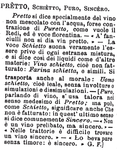 Pretto, Schietto, Puro, Sincero - Pretto si dice specialmente del vino non mescolato con l'acqua, forse contrazione di Puretto, come vuole il Redi, ed è voce fiorentina. - «A' fanciulli non si dia vin pretto.» - La voce Schietto suona veramente l'essere privo di ogni estranea mistura, e si dice così dei liquidi come d'altre materie: Vino schietto, cioè non fatturato: Farina schietta, e simili. Si trasporta anche al morale: Uomo schietto, cioè leale, senza involture o simulazioni e dissimulazioni. - [Puro, parlando di vino, s'usa talora nel senso medesimo di Pretto; ma può, come Schietto, significare anche Che non è fatturato: in quest'ultimo senso si dice comunemente Sincero. - «Non è un vino prelibato, ma sincero.» - «Nelle trattorie è difficile trovare un vino sincero.» - «Lo beva pure senza timore: è sincero.» G. F.] [immagine]