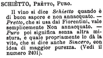 Schietto, Pretto, Puro - Il vino si dice Schietto quando è di buon sapore e non annacquato. - Pretto, che si usa dai Fiorentini, vale semplicemente Non annacquato. - Puro poi significa senza altra mistura, e quale propriamente lo dà la vite, che si dice anche Sincero, con idea di maggior purezza. (Vedi il numero 2401). [immagine]