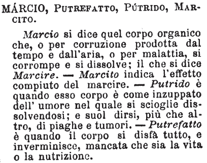 Marcio, Putrefatto, Putrido, Marcito - Marcio si dice quel corpo organico che, o per corruzione prodotta dal tempo e dall'aria, o per malattia, si corrompe e si dissolve; il che si dice Marcire. - Marcito indica l'effetto compiuto del marcire. - Putrido è quando esso corpo è come inzuppato dell'umore nel quale si scioglie dissolvendosi; e suol dirsi, più che altro, di piaghe e tumori. - Putrefatto è quando il corpo si disfà tutto, e inverminisce, mancata che sia la vita o la nutrizione. [immagine]