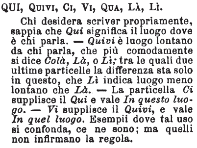 | Qui, Quivi, Ci, Vi, Qua, Là, Lì - Chi desidera scriver propriamente, sappia che Qui significa il luogo dove è chi parla. - Quivi è luogo lontano da chi parla, che più comodamente si dice Colà, Là, o Lì; tra le quali due ultime particelle la differenza sta solo in questo, che Lì indica luogo meno lontano che Là. - La particella Ci supplisce il Qui e vale In questo luogo. - Vi supplisce il Quivi, e vale In quel luogo. Esempii dove tal uso si confonda, ce ne sono; ma quelli non infirmano la regola. [immagine] |