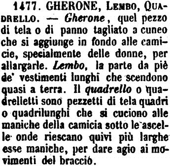 Gherone, Lembo, Quadrello - Gherone, quel pezzo di tela o di panno tagliato a cuneo che si aggiunge in fondo alle camicie, specialmente delle donne, per allargarle. Lembo, la parte da piè de' vestimenti lunghi che scendono quasi a terra. Il quadrello o quadrelletti sono pezzetti di tela quadri o quadrilunghi che si cuciono alle maniche della camicia sotto le ascelle onde riescano quivi più larghe esse maniche, per dare agio ai movimenti del braccio. [immagine]