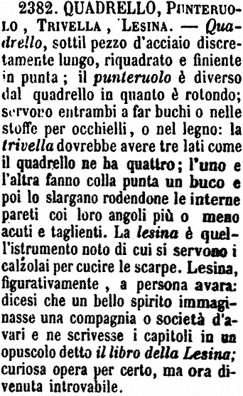 Quadrello, Punteruolo, Trivella, Lesina - Quadrello, sottil pezzo d'acciaio discretamente lungo, riquadrato e finiente in punta; il punteruolo è diverso dal quadrello in quanto è rotondo; servono entrambi a far buchi o nelle stoffe per occhielli, o nel legno: la trivella dovrebbe avere tre lati come il quadrello ne ha quattro; l'uno e l'altra fanno colla punta un buco e poi lo slargano rodendone le interne pareti coi loro angoli più o meno acuti e taglienti. La lesina è quell'istrumento noto di cui si servono i calzolai per cucire le scarpe. Lesina, figurativamente, a persona avara: dicesi che un bello spirito immaginasse una compagnia o società d'avari e ne scrivesse i capitoli in un opuscolo detto il libro della Lesina; curiosa opera per certo, ma ora divenuta introvabile. [immagine]