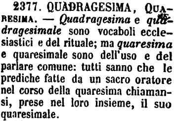 Quadragesima, Quaresima - Quadragesima e quadragesimale sono vocaboli ecclesiastici e del rituale; ma quaresima e quaresimale sono dell'uso e del parlare comune: tutti sanno che le prediche fatte da un sacro oratore nel corso della quaresima chiamansi, prese nel loro insieme, il suo quaresimale. [immagine]