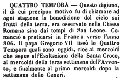 Quattro tempora - Questo digiuno, il di cui precipuo motivo fu di chiamare ad ogni stagione la benedizione del cielo sui frutti della terra, era osservato nella Chiesa Romana sino dai tempi di San Leone. Cominciò a praticarsi in Francia verso l'anno 806. Il papa Gregorio VII fissò le Quattro Tempora quali sono oggidì, cioè al mercoldì che segue all'Esaltazione della Santa Croce, al mercoldì della terza settimana dell'Avvento, e finalmente al primo mercoldì dopo la settimana delle Ceneri. [immagine]