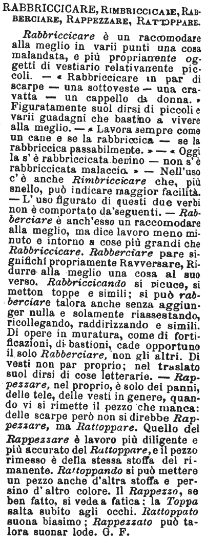 | Rabbriccicare, Rimbriccicare, Rabberciare, Rappezzare, Rattoppare - Rabbriccicare è un raccomodare alla meglio in varii punti una cosa malandata, e più propriamente oggetti di vestiario relativamente piccoli. - «Rabbriccicare un par di scarpe - una sottoveste - una cravatta - un cappello da donna.» Figuratamente suol dirsi di piccoli e varii guadagni che bastino a vivere alla meglio. - «Lavora sempre come un cane e se la rabbriccica - se la rabbriccica passabilmente.» - «Oggi la s'è rabbriccicata benino - non s'è rabbriccicata malaccio.» - Nell'uso c'è anche Rimbriccicare che, più snello, può indicare maggior facilità. - L'uso figurato di questi due verbi non è comportato da' seguenti. - Rabberciare è anch'esso un raccomodare alla meglio, ma dice lavoro meno minuto e intorno a cose più grandi che Rabbriccicare. Rabberciare pare significhi propriamente Ravversare, Ridurre alla meglio una cosa al suo verso. Rabbriccicando si ricuce, si metton toppe e simili; si può rabberciare talora anche senza aggiunger nulla e solamente riassestando, ricollegando, raddrizzando e simili. Di opere in muratura, come di fortificazioni, di bastioni, cade opportuno il solo Rabberciare, non gli altri. Di vesti non par proprio; nel traslato suol dirsi di cose letterarie. - Rappezzare, nel proprio, è solo dei panni, delle tele, delle vesti in genere, quando vi si rimette il pezzo che manca: delle scarpe però non si direbbe Rappezzare, ma Rattoppare. Quello del Rappezzare è lavoro più diligente e più accurato del Rattoppare, e il pezzo rimesso è della stessa stoffa del rimanente. Rattoppando si può mettere un pezzo anche d'altra stoffa e persino d'altro colore. Il Rappezzo, se ben fatto, si vede a fatica; la Toppa salta subito agli occhi. Rattoppato suona biasimo; Rappezzato può talora suonar lode. G. F. [immagine] |