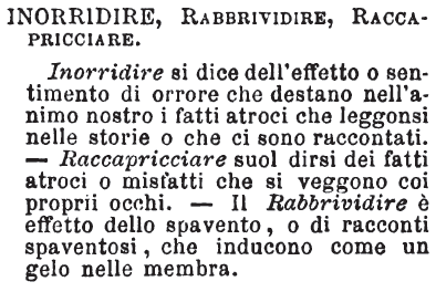 Inorridire, Rabbrividire, Raccapricciare - Inorridire si dice dell'effetto o sentimento di orrore che destano nell'animo nostro i fatti atroci che leggonsi nelle storie o che ci sono raccontati. - Raccapricciare suol dirsi dei fatti atroci o misfatti che si veggono coi proprii occhi. - Il Rabbrividire è effetto dello spavento, o di racconti spaventosi, che inducono come un gelo nelle membra. [immagine]
