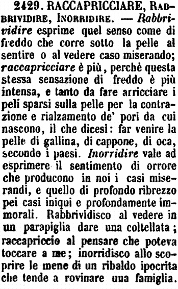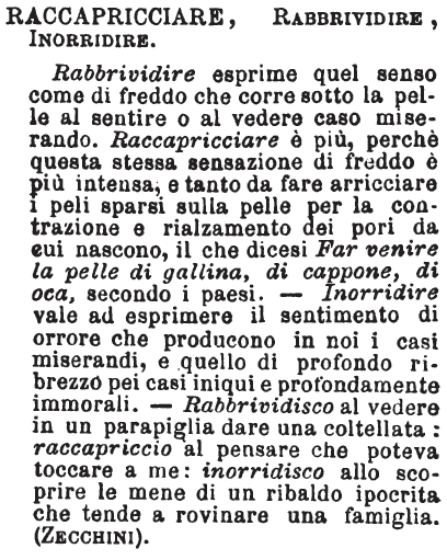 Raccapricciare, Rabbrividire, Inorridire - Rabbrividire esprime quel senso come di freddo che corre sotto la pelle al sentire o al vedere caso miserando; raccapricciare è più, perchè questa stessa sensazione di freddo è più intensa, e tanto da fare arricciare i peli sparsi sulla pelle per la contrazione e rialzamento de' pori da cui nascono, il che dicesi: far venire la pelle di gallina, di cappone, di oca, secondo i paesi. Inorridire vale ad esprimere il sentimento di orrore che producono in noi i casi miserandi, e quello di profondo ribrezzo pei casi iniqui e profondamente immorali. Rabbrividisco al vedere in un parapiglia dare una coltellata; raccapriccio al pensare che poteva toccare a me; inorridisco allo scoprire le mene di un ribaldo ipocrita che tende a rovinare una famiglia. [immagine]
