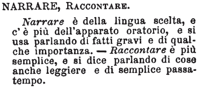 Narrare, Raccontare - Narrare è della lingua scelta, e c'è più dell'apparato oratorio, e si usa parlando di fatti gravi e di qualche importanza. - Raccontare è più semplice, e si dice di cose anche leggiere e di semplice passatempo. [immagine]