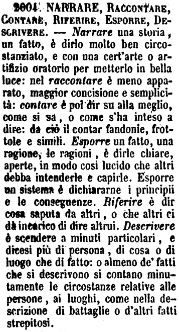 Narrare, Raccontare, Contare, Riferire, Esporre, Descrivere - Narrare una storia, un fatto, è dirlo molto ben circostanziato, e con una cert'arte o artifizio oratorio per metterlo in bella luce: nel raccontare è meno apparato, maggior concisione e semplicità: contare è poi dir su alla meglio, come si sa, o come s'ha inteso a dire: da ciò il contar fandonie, frottole e simili. Esporre un fatto, una ragione, le ragioni, è dirle chiare, aperte, in modo così lucido che altri debba intenderle e capirle. Esporre un sistema è dichiararne i principii e le conseguenze. Riferire è dir cosa saputa da altri, o che altri ci dà incarico di dire altrui. Descrivere è scendere a minuti particolari, e dicesi più di persona, di cosa o di luogo che di fatto: o almeno de' fatti che si descrivono si contano minutamente le circostanze relative alle persone, ai luoghi, come nella descrizione di battaglie o d'altri fatti strepitosi. [immagine]