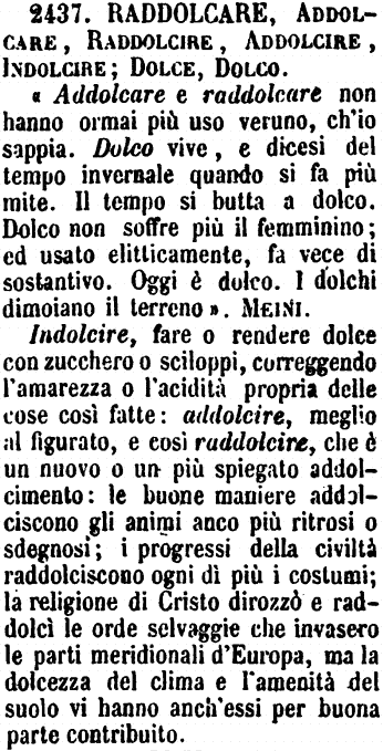 | Raddolcare, Addolcare, Raddolcire, Addolcire, Indolcire; Dolce, Dolco - « Addolcare e raddolcare non hanno ormai più uso veruno, ch'io sappia. Dolco vive, e dicesi del tempo invernale quando si fa più mite. Il tempo si butta a dolco. Dolco non soffre più il femminino; ed usato elitticamente, fa vece di sostantivo. Oggi è dolco. I dolchi dimoiano il terreno ». Meini.