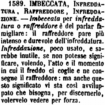 | Imbeccata, Infreddatura, Raffreddore, Infreddazione - Imbeccata per infreddatura o raffreddore è del parlar famigliare: il raffreddore pare più intenso e durevole dell'infreddatura. Infreddazione, poco usato, e sarebbe inutile, se non potesse significare, volendo, l'atto e il momento in cui il freddo ci coglie e ne consegue il raffreddore: ma anche questo significato vi sta così avviluppato che bisogna, per discernerlo, volervelo vedere per forza. [immagine] |