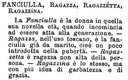 | Fanciulla, Ragazza, Ragazzetta, Ragazzina - La Fanciulla è la donna in quella sua novella età, quando incomincia ad essere atta alla generazione. - Ragazza, nell'uso toscano, è la fanciulla già da marito, cioè un poco introdotta nella pubertà. - Ragazzetta è ragazza non alta della persona. - Ragazzina è lo stesso, ma con più idea di garbatezza e di grazia. [immagine] |