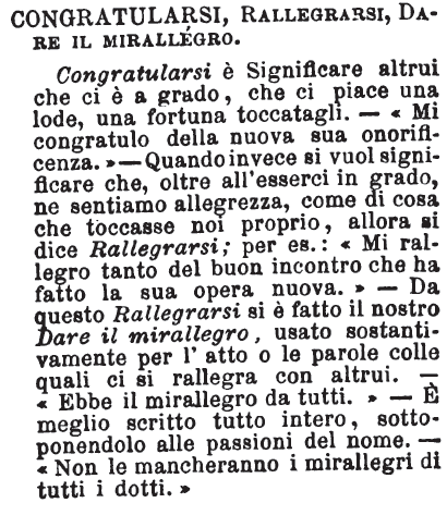 «Dare il mi rallegro è congratularsi. Se vedete il tale dategli il mi rallegro per il suo matrimonio; frase di uso comunissima». Cioni. [immagine]