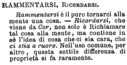 | Rammentarsi, Ricordarsi - Rammentarsi è il puro tornarci alla mente una cosa. - Ricordarsi, che viene da Cor, non solo è Richiamare tal cosa alla mente, ma contiene in sè l'idea di cosa che ci sia cara, che ci stia a cuore. Nell'uso comune, per altro, questa sottile differenza di proprietà si fa raramente. [immagine] |