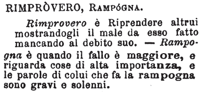 | Rimprovero, Rampogna - Rimprovero è Riprendere altrui mostrandogli il male da esso fatto mancando al debito suo. - Rampogna è quando il fallo è maggiore, e riguarda cose di alta importanza, e le parole di colui che fa la rampogna sono gravi e solenni. [immagine] |