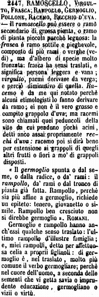 | Ramoscello, Virgulto, Frasca; Rampollo, Germoglio, Pollone, Racemo, Recchio d'uva - Il ramoscello può essere o ramo secondario di grossa pianta, o ramo di pianta piccola purchè legnosa: la frasca è ramo sottile e pieghevole, composto di più rami o verghe (vedi), ma d'albero di specie molto fronzuta: frasca ha sensi traslati, e significa persona leggera e vana; virgulto, parmi derivare da verga; e perciò diminutivo di quella. Racemo è da me qui notato perchè alcuni etimologisti lo fanno derivare da ramo; ei non è il vero grosso e compito grappolo d'uva; ma racemi sono chiamati quei peduncoli della vite da cui pendono pochi acini, detti anco assai propriamente recchi d'uva: racemo poi si dirà bene per estensione ai grappoli di quegli altri frutti o fiori a mo' di grappoli disposti.