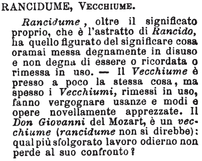 Rancidume, Vecchiume - Rancidume, oltre il significato proprio, che è l'astratto di Rancido, ha quello figurato del significare cosa oramai messa degnamente in disuso e non degna di essere o ricordata o rimessa in uso. - Il Vecchiume è presso a poco la stessa cosa, ma spesso i Vecchiumi, rimessi in uso, fanno vergognare usanze e modi e opere novellamente apprezzate. Il Don Giovanni del Mozart, è un vecchiume (rancidume non si direbbe): qual più sfolgorato lavoro odierno non perde al suo confronto? [immagine]
