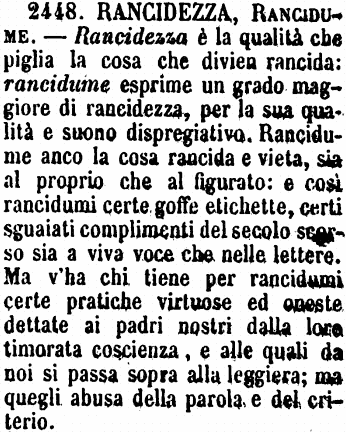 Rancidezza, Rancidume - Rancidezza è la qualità che piglia la cosa che divien rancida: rancidume esprime un grado maggiore di rancidezza, per la sua qualità e suono dispregiativo. Rancidume anco la cosa rancida e vieta, sia al proprio che al figurato: e così rancidumi certe goffe etichette, certi sguaiati complimenti del secolo scorso sia a viva voce che nelle lettere. Ma v'ha chi tiene per rancidumi certe pratiche virtuose ed oneste dettate ai padri nostri dalla loro timorata coscienza, e alle quali da noi si passa sopra alla leggiera; ma quegli abusa della parola e del criterio. [immagine]