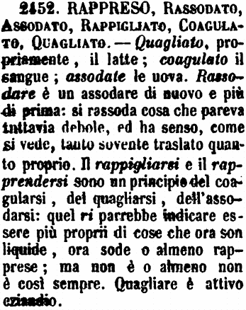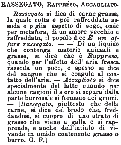 Rassegato, Rappreso, Accagliato - Rassegato si dice di carne grassa, la quale cotta e poi raffreddata assoda e piglia aspetto di sego, onde per metafora, di un amore vecchio e raffreddato, il popolo dice È un affare rassegato. - - Di un liquido che contenga materie animali e grasse, si dice che è Rappreso, quando per l’effetto dell’aria fresca rassoda un poco, e spesso si dice del sangue che si coagula al contatto dell’aria. - Accagliato si dice specialmente del latte quando per alcune cagioni il siero si separa dalla parte burrosa e si formano dei grumi. – [Rassegato, piuttosto che della carne, si dice del brodo che, freddandosi, si cuopre di uno strato di grasso che viene a galla e si rapprende, e anche dell’intinto di vivande in umido contenente grasso o burro. G. F.] [immagine]