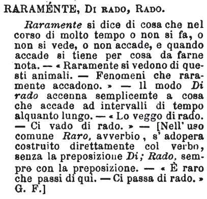 Raramente, Di rado, Rado - Raramente si dice di cosa che nel corso di molto tempo o non si fa, o non si vede, o non accade, e quando accade si tiene per cosa da farne nota. - «Raramente si vedono di questi animali. - Fenomeni che raramente accadono.» - Il modo Di rado accenna semplicemente a cosa che accade ad intervalli di tempo alquanto lungo. - «Lo veggo di rado. – Ci vado di rado.» - [Nell’uso comune Raro avverbio, s’adopera costruito direttamente col verbo, senza la preposizione Di; Rado, sempre con la preposizione. - «E’ raro che passi di qui. – Ci passa di rado.» G. F.] [immagine]
