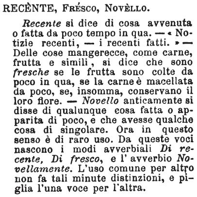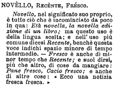 | Novello, Recente, Fresco - Novello, nel significato suo proprio, è tutto ciò che è incominciato da poco in qua: Età novella, la novella edizione di un libro; ma questo uso è della lingua scelta; e nell'uso più comune dicesi Recente, benchè questa voce indichi spazio minore di tempo intermedio. - Fresco è anche di minor tempo che Recente; e suol dirsi, più che altro, di cose da mangiare: Pane fresco, Cacio fresco; e anche di altre cose: « Ecco una notizia fresca fresca. » [immagine] |