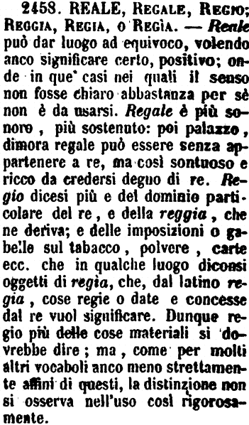 Reale, Regale, Regio; Reggia, Regia, o Regìa - Reale può dar luogo ad equivoco, volendo anco significare certo, positivo; onde in que' casi nei quali il senso non fosse chiaro abbastanza per sè non è da usarsi. Regale è più sonoro, più sostenuto: poi palazzo, dimora regale può essere senza appartenere a re, ma così sontuoso e ricco da credersi degno di re. Regio dicesi più e del dominio particolare del re, e della reggia, che ne deriva; e delle imposizioni o gabelle sul tabacco, polvere, carte ecc. che in qualche luogo diconsi oggetti di regìa, che, dal latino regia, cose regie o date e concesse dal re vuol significare. Dunque regio più delle cose materiali si dovrebbe dire; ma, come per molti altri vocaboli anco meno strettamente affini di questi, la distinzione non si osserva nell'uso così rigorosamente. [immagine]