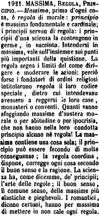 | Massima, Regola, Principio - Massima, prima d'ogni cosa, è regola di morale: principio è massima fondamentale e cardinale; i principii servon di regola: i principii d'una scienza la contengono in germe, in succinto. Intendersi in massima, vale sull'insieme e sui punti più importanti della quistione. La regola segna i limiti del come dirigere e moderare le azioni: perciò forse i fondatori di ordini religiosi intitolarono regola il loro codice speciale, dietro cui intendevano avessero a reggersi le loro case, monasteri o conventi. Quanti vanno sfoggiando massime d'austera morale o per abitudine o per ipocrisia, che non hanno nella loro condotta principio alcuno nè regola! La massima contiene una cosa sola; il principio può essere fecondo di molte conseguenze; la regola coordina, dispone, corregge ogni cosa secondo il buon senso e la ragione. La scienza ha, come dicemmo, de' principii; l'arte delle regole; il buon senso, il comune senso, delle massime più elastiche e pieghevoli. I romantici, dicono certuni, hanno per massima di mettere in non cale ogni regola. [immagine] |