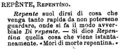 | Repente, Repentino - Repente suol dirsi di cosa che venga tanto rapida da non potersene guardare, onde si fa il modo avverbiale Di repente. - Si dice Repentina quella cosa che viene istantaneamente. « Morì di morte repentina. » [immagine] |