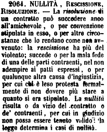 | Nullità, Rescissione, Risoluzione - La risoluzione di un contratto può succedere anco all'amichevole, o per convenzione stipulata in esso, o per altre circostanze che lo rendano come non avvenuto: la rescissione ha più del violento; succede o per la mala fede di una delle parti contraenti, nel non adempiere ai patti espressi, o per qualunque altra causa d'ingiustizia, per cui chi è leso protesta formalmente di non dovere più stare a quanto si era stipulato. La nullità risulta o da vizio del contratto o de' contraenti, per cui in giudizio non possa essere tenuto valido: la legge determina i casi di nullità. [immagine] |