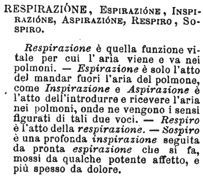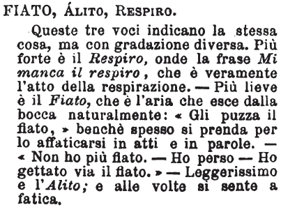 Fiato, Alito, Respiro - Queste tre voci indicano la stessa cosa, ma con gradazione diversa. Più forte è il Respiro, onde la frase Mi manca il respiro, che è veramente l'atto della respirazione. - Più lieve è il Fiato, che è l'aria che esce dalla bocca naturalmente: «Gli puzza il fiato,» benchè spesso si prenda per lo affaticarsi in atti e in parole. - «Non ho più fiato. - Ho perso - Ho gettato via il fiato.» - Leggerissimo e l'Alito; e alle volte si sente a fatica. [immagine]