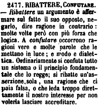 | Ribattere, Confutare - Ribattere un argomento è affermare sul fatto il suo opposto, negarlo, dire ragione in contrario: molte volte però con più forza che logica. A confutare occorrono ragioni vere e molte parole che le mettano in luce; e modo e dialettica. Ordinariamente si confuta tutto un sistema o il principio fondamentale che lo regge; si ribatte un'asserzione, sola, una ragione che ci paia falsa, o che leda troppo direttamente il nostro interesse per non volerla lasciare accreditare. [immagine] |
