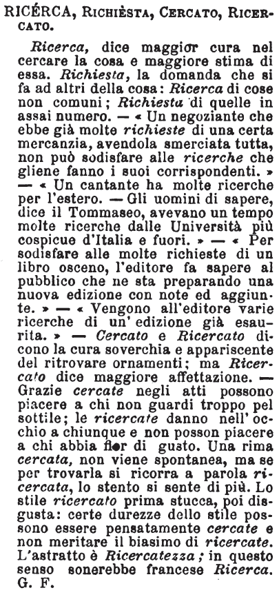 | Ricerca, Richiesta, Cercato, Ricercato - Ricerca, dice maggior cura nel cercare la cosa e maggiore stima di essa. Richiesta, la domanda che si fa ad altri della cosa: Ricerca di cose non comuni; Richiesta di quelle in assai numero. - «Un negoziante che ebbe già molte richieste di una certa mercanzia, avendola smerciata tutta, non può sodisfare alle ricerche che gliene fanno i suoi corrispondenti.» - «Un cantante ha molte ricerche per l’estero. – Gli uomini di sapere, dice il Tommaseo, avevano un tempo molte ricerche dalle Università più cospicue d’Italia e fuori.» - «Per sodisfare alle molte richieste di un libro osceno, l’editore fa sapere al pubblico che ne sta preparando una nuova edizione con note ed aggiunte.» - «Vengono all’editore varie ricerche di un’edizione già esaurita.» - Cercato e Ricercato dicono la cura soverchia e appariscente del ritrovare ornamenti; ma Ricercato dice maggiore affettazione. – Grazie cercate negli atti possono piacere a chi non guardi troppo pel sottile; le ricercate danno nell’occhio a chiunque e non posson piacere a chi abbia fior di gusto. Una rima cercata, non viene spontanea, ma se per trovarla si ricorra a parola ricercata, lo stento si sente di più. Lo stile ricercato prima stucca, poi disgusta: certe durezze dello stile possono essere pensatamente cercate e non meritare il biasimo di ricercate. L’astratto è Ricercatezza; in questo senso sonerebbe francese Ricerca. G. F. [immagine] |