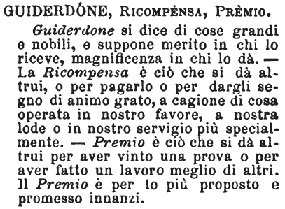 Guiderdone, Ricompensa, Premio - Guiderdone si dice di cose grandi e nobili, e suppone merito in chi lo riceve, magnificenza in chi lo dà. - La Ricompensa è ciò che si dà altrui, o per pagarlo o per dargli segno di animo grato, a cagione di cosa operata in nostro favore, a nostra lode o in nostro servigio più specialmente. - Premio è ciò che si dà altrui per aver vinto una prova o per aver fatto un lavoro meglio di altri. Il Premio è per lo più proposto e promesso innanzi. [immagine]