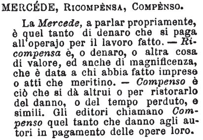 Mercede, Ricompensa, Compenso - La Mercede, a parlar propriamente, è quel tanto di denaro che si paga all'operajo per il lavoro fatto. - Ricompensa è, o denaro, o altra cosa di valore, ed anche di magnificenza, che è data a chi abbia fatto imprese o atti che meritino. - Compenso è ciò che si dà altrui o per ristorarlo del danno, o del tempo perduto, e simili. Gli editori chiamano Compenso quel tanto che danno agli autori in pagamento delle opere loro. [immagine]