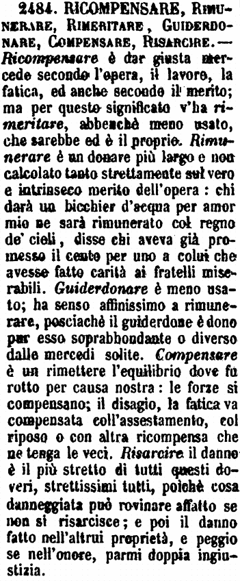 | Ricompensare, Rimunerare, Rimeritare, Guiderdonare, Compensare, Risarcire - Ricompensare è dar giusta mercede secondo l'opera, il lavoro, la fatica, ed anche secondo il merito; ma per questo significato v'ha rimeritare, abbenchè meno usato, che sarebbe ed è il proprio. Rimunerare è un donare più largo e non calcolato tanto strettamente sul vero e intrinseco merito dell'opera: chi darà un bicchier d'acqua per amor mio ne sarà rimunerato col regno de' cieli, disse chi aveva già promesso il cento per uno a colui che avesse fatto carità ai fratelli miserabili. Guiderdonare è meno usato; ha senso affinissimo a rimunerare, posciachè il guiderdone è dono pur esso soprabbondante o diverso dalle mercedi solite. Compensare è un rimettere l'equilibrio dove fu rotto per causa nostra: le forze si compensano; il disagio, la fatica va compensata coll'assestamento, col riposo o con altra ricompensa che ne tenga le veci. Risarcire il danno è il più stretto di tutti questi doveri, strettissimi tutti, poichè cosa danneggiata può rovinare affatto se non si risarcisce; e poi il danno fatto nell'altrui proprietà, e peggio se nell'onore, parmi doppia ingiustizia. [immagine] |