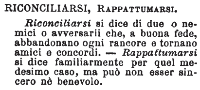 | Riconciliarsi, Rappattumarsi - Riconciliarsi si dice di due o nemici o avversarii che, a buona fede, abbandonano ogni rancore e tornano amici e concordi. - Rappattumarsi si dice familiarmente per quel medesimo caso, ma può non esser sincero nè benevolo. [immagine] |