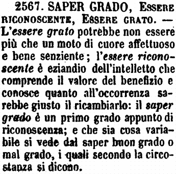 Saper grado, Essere riconoscente, Essere grato - L'essere grato potrebbe non essere più che un moto di cuore affettuoso e bene senziente; l'essere riconoscente è eziandio dell'intelletto che comprende il valore del benefizio e conosce quanto all'occorrenza sarebbe giusto il ricambiarlo: il saper grado è un primo grado appunto di riconoscenza; e che sia cosa variabile di vede dal saper buon grado o mal grado, i quali secondo la circostanza si dicono. [immagine]
