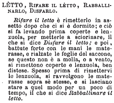 Letto, Rifare il letto, Rabballinarlo, Disfarlo - Rifare il letto è rimetterlo in assetto dopo che ci si è dormito; e ciò si fa levando prima coperte e lenzuola, per metterle a sciorinare, il che si dice Disfare il letto; e poi, battute forte con le mani le materasse, e rialzate le foglie del saccone, se questo non è a molla, o a vento, si rimettono coperte e lenzuola, ben distese. Spesso prima di rimettervi le lenzuola, si ravvolgono le materasse sopra sè stesse, e si lasciano stare a quel modo per un poco di tempo, il che si dice Rabballinare il letto. [immagine]