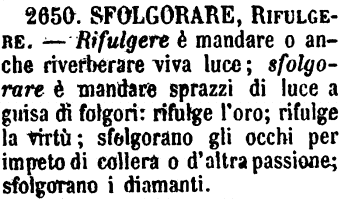 Sfolgorare, Rifulgere - Rifulgere è mandare o anche riverberare viva luce; sfolgorare è mandare sprazzi di luce a guisa di folgori: rifulge l'oro; rifulge la virtù; sfolgorano gli occhi per impeto di collera o d'altra passione; sfolgorano i diamanti. [immagine]