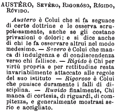 | Austero, Severo, Rigoroso, Rigido, Ruvido - Austero è Colui che si fa seguace di certe dottrine e le osserva scrupolosamente, anche se gli costano privazioni o dolori; e si dice anche di chi le fa osservare altrui nel modo medesimo. - Severo è Colui che manca di indulgenza e di condiscendenza verso chi fallisce. - Rigido è Chi per virtù propria e per rettitudine resta invariabilmente attaccato alle regole del suo istituto - Rigoroso è Colui che punisce duramente i falli di disciplina. - Ruvido finalmente, Chi manca di cortesia, di riguardi, di compitezza, e generalmente mostrasi serio e accigliato. [immagine] |