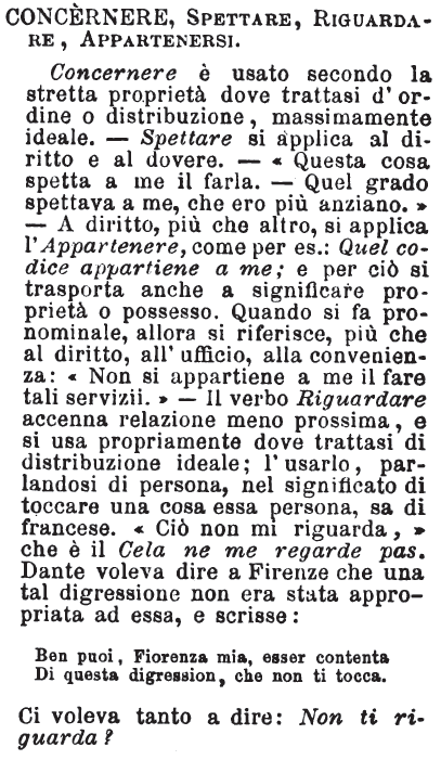 | Concernere, Spettare, Riguardare, Appartenersi - Concernere è usato secondo la stretta proprietà dove trattasi d'ordine o distribuzione, massimamente ideale. - Spettare si applica al diritto e al dovere. - «Questa cosa spetta a me il farla. - Quel grado spettava a me, che ero più anziano.» - A diritto, più che altro, si applica l'Appartenere, come per es.: Quel codice appartiene a me; e per ciò si trasporta anche a significare proprietà o possesso. Quando si fa pronominale, allora si riferisce, più che al diritto, all'ufficio, alla convenienza: «Non si appartiene a me il fare tali servizii.» - Il verbo Riguardare accenna relazione meno prossima, e si usa propriamente dove trattasi di distribuzione ideale; l'usarlo, parlandosi di persona, nel significato di toccare una cosa essa persona, sa di francese. «Ciò non mi riguarda,» che è il Cela ne me regarde pas. Dante voleva dire a Firenze che una tal digressione non era stata appropriata ad essa, e scrisse: