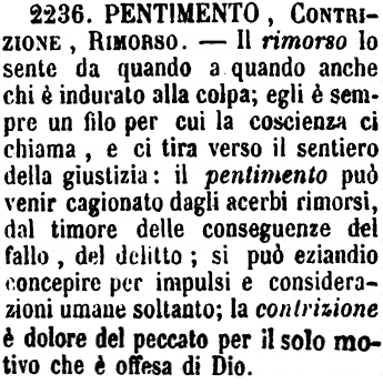 Pentimento, Contrizione, Rimorso - Il rimorso lo sente da quando a quando anche chi è indurato alla colpa; egli è sempre un filo per cui la coscienza ci chiama, e ci tira verso il sentiero della giustizia: il pentimento può venir cagionato dagli acerbi rimorsi, dal timore delle conseguenze del fallo, del delitto; si può eziandio concepire per impulsi e considerazioni umane soltanto; la contrizione è dolore del peccato per il solo motivo che è offesa di Dio. [immagine]
