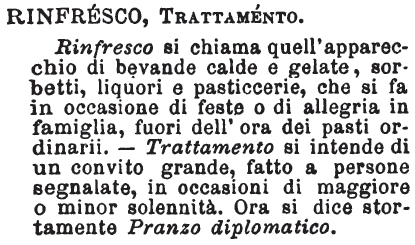 | Rinfresco, Trattamento - Rinfresco si chiama quell'apparecchio di bevande calde e gelate, sorbetti, liquori e pasticcerie, che si fa in occasione di feste o di allegria in famiglia, fuori dell'ora dei pasti ordinarii. - Trattamento si intende di un convito grande, fatto a persone segnalate, in occasioni di maggiore o minor solennità. Ora si dice stortamente Pranzo diplomatico. [immagine] |