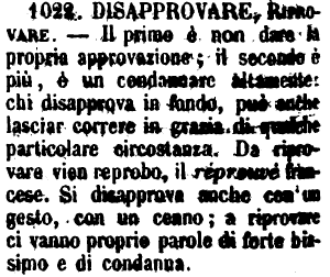 | Disapprovare, Riprovare - Il primo è Non dare la propria approvazione; il secondo è più, è un condannare altamente: chi disapprova, può anche lasciar correre in grazia di qualche particolare congiuntura. Da Riprovare vien Reprobo, il Réprouvé francese. Si disapprova anche con un gesto, con un cenno; a riprovare ci vanno proprio parole di forte biasimo e di condanna (Zecchini). [immagine] |
