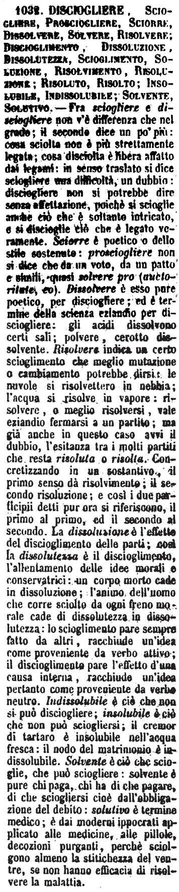 | Disciogliere, Sciogliere, Prosciogliere, Sciorre, Dissolvere, Solvere, Risolvere; Discioglimento, Dissoluzione, Dissolutezza, Scioglimento, Soluzione, Risolvimento, Risoluzione; Risoluto, Risolto; Insolubile, Indissolubile; Solvente, Solutivo - Fra sciogliere e disciogliere non v'è differenza che nel grado; il secondo dice un po' più: cosa sciolta non è più strettamente legata; cosa disciolta è libera affatto dai legami: in senso traslato si dice sciogliere una difficoltà, un dubbio: disciogliere non si potrebbe dire senza affettazione, poichè si scioglie anche ciò che è soltanto intricato, e si discioglie ciò che è legato veramente. Sciorre è poetico o dello stile sostenuto: prosciogliere non si dice che da un voto, da un patto e simili, quasi solvere pro (auctoritate, eo). Dissolvere è esso pure poetico, per disciogliere; ed è termine della scienza eziandio per disciogliere: gli acidi dissolvono certi sali; polvere, cerotto dissolvente. Risolvere indica un certo scioglimento che meglio mutazione o cambiamento potrebbe dirsi: le nuvole si risolvettero in nebbia; l'acqua si risolve in vapore: risolvere, o meglio risolversi, vale eziandio fermarsi a un partito; ma già anche in questo caso avvi il dubbio, l'esitanza tra i molti partiti che resta risoluta o risolta. Concretizzando in un sostantivo, il primo senso dà risolvimento; il secondo risoluzione; e così i due participii detti pur ora si riferiscono, il primo al primo, ed il secondo al secondo. La dissoluzione è l'effetto del discioglimento delle parti; così la dissolutezza è il discioglimento, l'allentamento delle idee morali e conservatrici: un corpo morto cade in dissoluzione; l'animo dell'uomo che corre sciolto da ogni freno morale cade di dissolutezza in dissolutezza: lo scioglimento pare sempre fatto da altri, racchiude un'idea come proveniente da verbo attivo; il discioglimento pare l'effetto d'una causa interna, racchiude un'idea pertanto come proveniente da verbo neutro. Indissolubile è ciò che non si può disciogliere; insolubile è ciò che non può sciogliersi; il cremor di tartaro è insolubile nell'acqua fresca: il nodo del matrimonio è indissolubile. Solvente è ciò che scioglie, che può sciogliere: solvente è pure chi paga, chi ha di che pagare, di che sciogliersi cioè dall'obbligazione del debito: solutivo è termine medico; è dai moderni ippocrati applicato alle medicine, alle pillole, decozioni purganti, perché sciolgono almeno la stitichezza del ventre, se non hanno efficacia di risolvere la malattia. [immagine] |