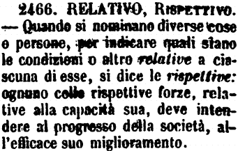 Relativo, Rispettivo - Quando si nominano diverse cose e persone, per indicare quali siano le condizioni o altro relative a ciascuna di esse, si dice le rispettive: ognuno colle rispettive forze, relative alla capacità sua, deve intendere al progresso della società, all'efficace suo miglioramento. [immagine]